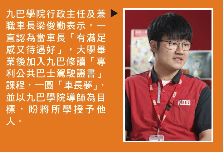 九巴学院行政主任及兼职车长梁俊勤,一直认为当车长「有满足感且待遇好」。大学毕业后,他加入九巴,修读「专利公共巴士驾驶证书」课程,一圆「车长梦」。加入九巴初期,由于缺乏大型汽车驾驶经验,他感到紧张。然而,在导师细心指导下,他一次通过运输署考试,正式成为车长,并以九巴学院的导师为目标,盼将所学授予他人。如今,他除了是兼职车长,也是九巴学院的行政主任,负责训练课程的安排、统筹及协调。他指目前的工作发展,在当初报读课程时,是意想不到的。